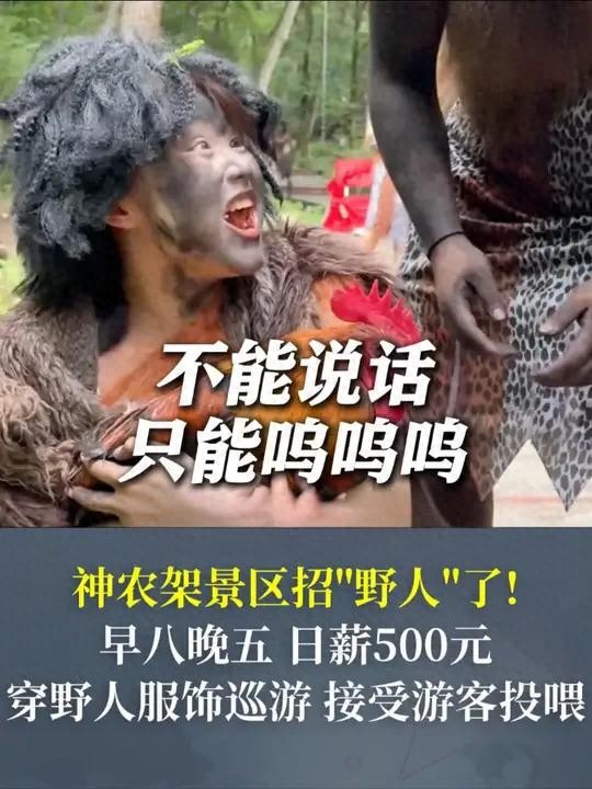 本來不敢相信,然而這是真的。極日新聞6月9日?qǐng)?bào)道,湖北神農(nóng)架景區(qū)竟然公開招聘"野人",日薪就是每天的工資500元,且有多項(xiàng)規(guī)定。譬如這"野人"可以大膽接受游客投喂,水果、面包都可以吃的。又譬如不許和游客說話,野人不許說話,只許"鳴嗚"吼叫等等。