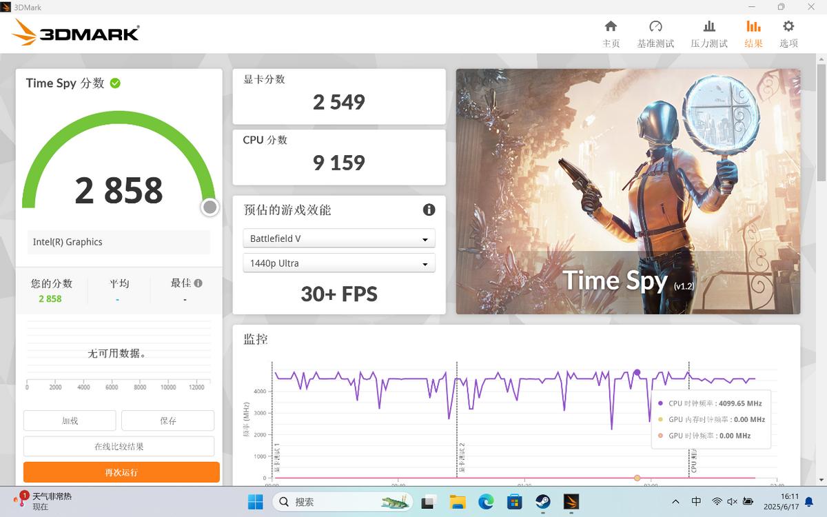 ▲3Dmark測試主要反映顯卡的理論性能,在3Dmark TimeSpy測試中,該機型顯卡分數為2549。需要注意的是,想要完整發揮Arc核顯性能,需滿足雙通道內存且內存總容量大于16GB。