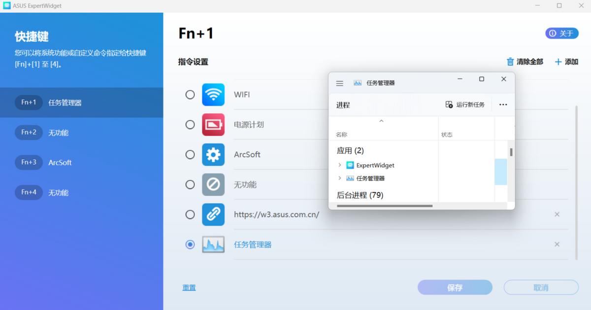 ▲在ASUS ExpertWidget中,可以對商用藍鍵進行功能自定義,比如切換電源性能模式、打開特定網址鏈接。進一步提升快捷鍵的接管程度,滿足一鍵直達的高效率要求。